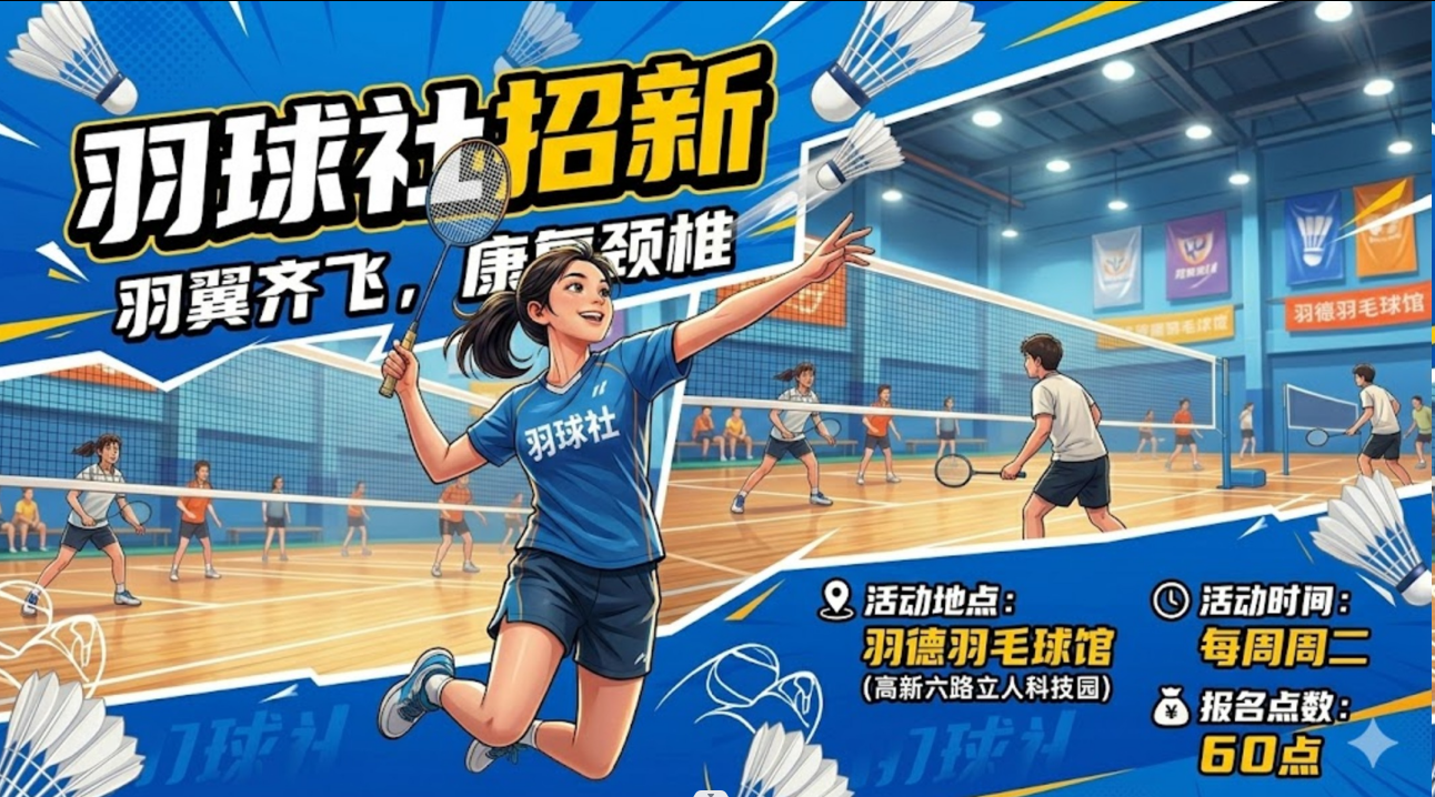 无论是想体验羽球竞技,还是简单放松身体活动颈椎,这里都有适合你的伙伴,每周1到2次活动。欢迎加入羽球社,羽中飞行,热血同行!