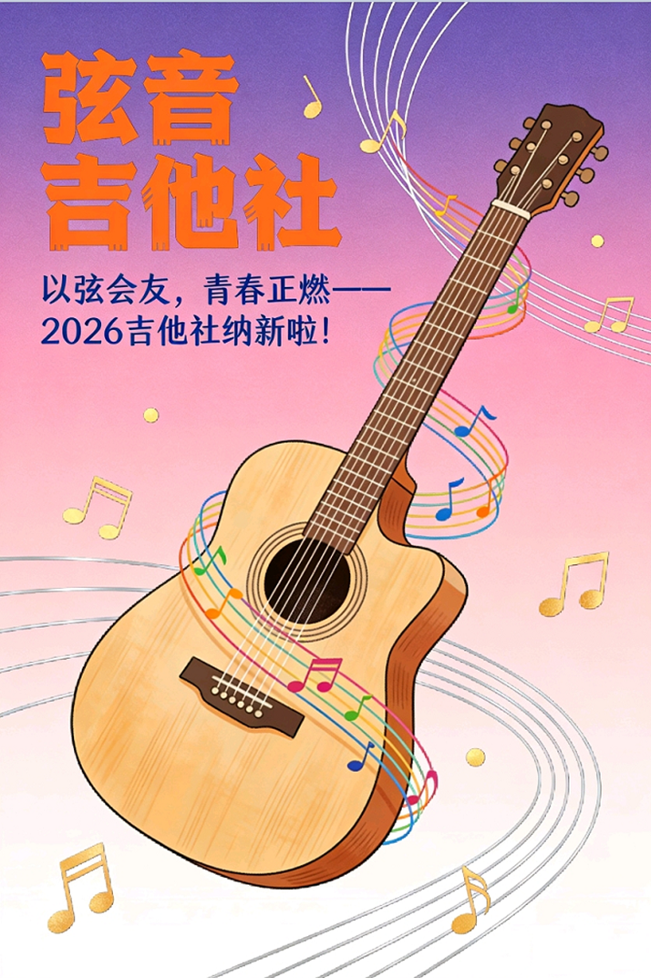 吉他社等你来!弹唱,指弹,改编,玩法多样。零基础也能轻松上手,用和弦编织青春,快来和我们一起玩转音乐吧!