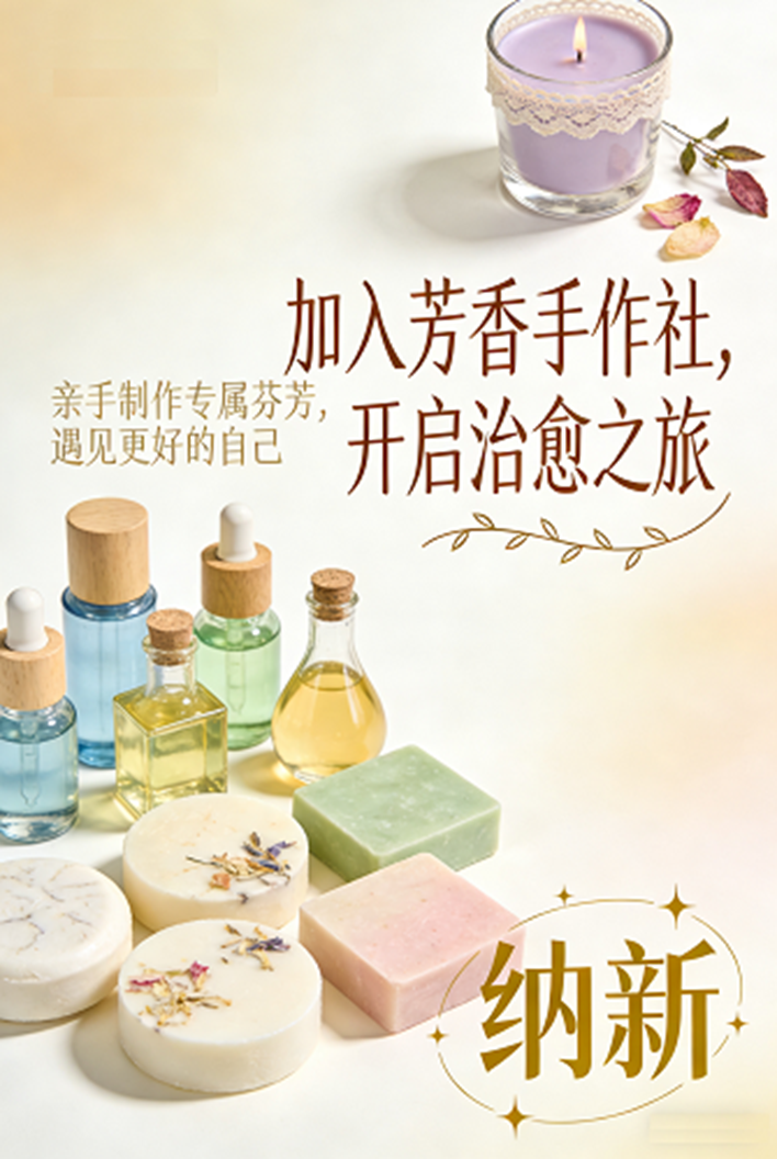 以香会友,解锁香薰蜡烛,扩香石,手工香皂等手作乐趣。亲手调香制物,邂逅自然芬芳,在慢时光里疗愈身心,打造独属于你的香氛小美好,一起玩转芳香手作吧!