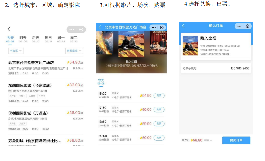 电影通兑:对接猫眼、淘票票。全国近万家影院,线上选座线 下兑换电影票。资源覆盖广、价格优惠多,覆盖 500 多个城市 , 10000 多家电影院