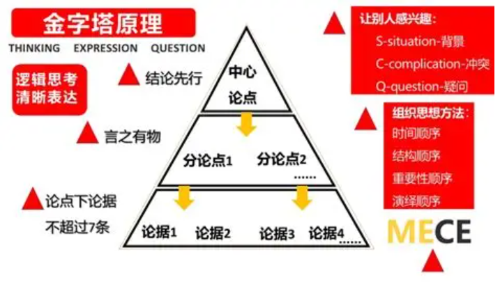 最后补充下什么是金字塔原理,它是一种重点突出、逻辑清晰、主次分明的逻辑思路、表达方式和规范动作。它的基本结构就是:结论先行,以上统下,归类分组,逻辑递进。先重要后次要,先总结后具体,先框架后细节,先结论后原因,先结果后过程,先论点后论据。