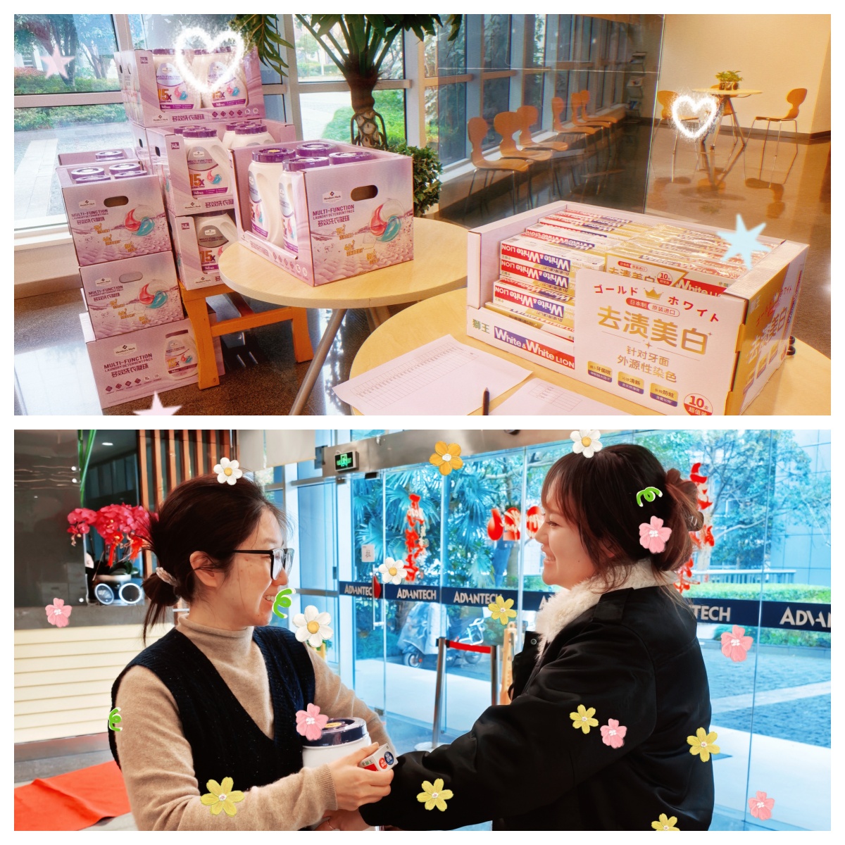 一大早,公司大厅就被精心布置成了温馨的福利站,山姆留香洗衣凝珠和进口狮王去渍牙膏整齐码放,等待着各位女神前来领取。大家陆续来到现场,有的认真签到登记,有的迫不及待拆开包装感受香气,还有的互相分享着这份小确幸,欢声笑语充满了整个会客区。