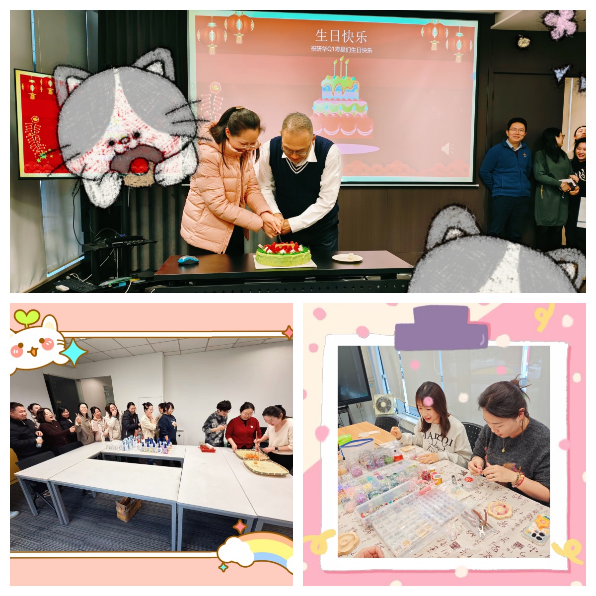 庆生时刻:屏幕上滚动着“生日快乐”的祝福,寿星代表们携手切下春日里的第一块蛋糕,奶油香气四溢,大家围在一旁鼓掌欢呼,把最真挚的祝福送给彼此,仪式感直接拉满。