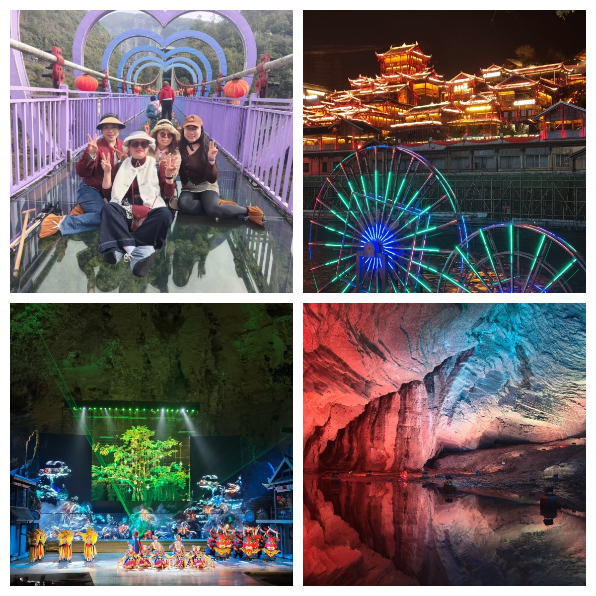 清晨奔赴利川腾龙洞,赴一场“天下第一洞”的震撼之约。作为世界特级洞穴之一,宽大的洞口竟然能容得下热气球升空,确实叹为观止。沿着洞继续行走,洞中有山、山中有洞的,终年恒温14-18℃,是天然的清凉秘境。洞内灯光勾勒出千姿百态的钟乳石,地下瀑布潺潺作响,卧龙吞江瀑布落差20余米,吼声如雷,气势磅礴。坐在洞穴剧场里,欣赏《夷水丽川》土家族情景歌舞,激光秀在空旷洞穴中变幻光影,仿佛穿越千年,读懂土家先民的传说。看一场“女儿会·赶场相亲”的实景剧,沉浸式感受土家儿女以歌为媒的浪漫。