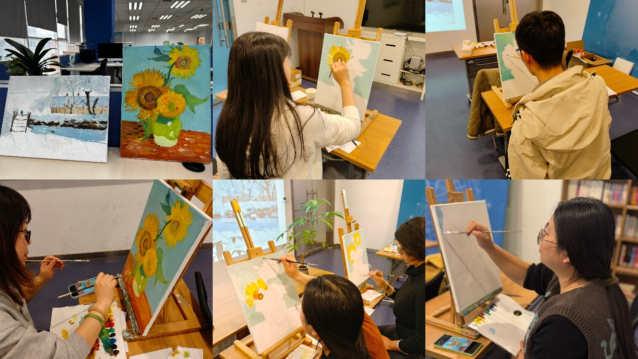 贴心的老师早已为我们准备好了超齐全的画材。看着排列整齐的画布、颜料和画笔,我们这些“零基础”的上班族,心里也有了底气。老师用轻松易懂的方式,带我们走进了油画的世界。尽管不少伙伴是第一次执笔,但两位老师始终温柔陪伴。他们时而轻声点拨,时而亲手示范,耐心地帮我们化解调色与落笔的小难题。无论是向日葵的浓烈,还是雪中喜鹊的朦胧,在老师的引导下,都渐渐在画布上生动浮现。