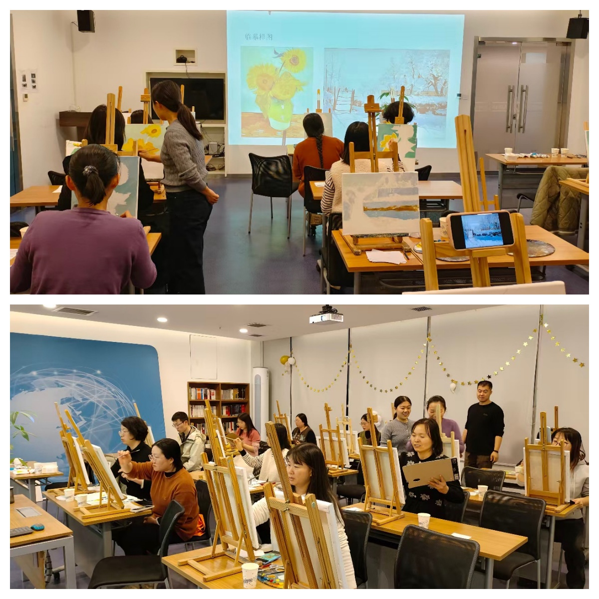 结束了一天忙碌的工作,我们并没有匆匆回家,而是奔赴一场关于色彩与放松的约会——周三下班后,一场温馨的油画沙龙在暖黄的灯光下如期开启。